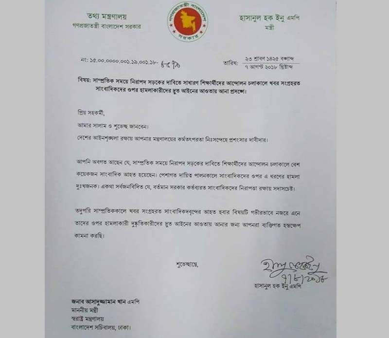 চিঠিতে বলা হয়েছে, সম্প্রতি নিরাপদ সড়কের দাবিতে শিক্ষার্থীদের আন্দোলন চলাকালে হামলায় বেশ কয়েকজন সাংবাদিক আহত হয়েছেন। পেশাগত দায়িত্ব পালনকালে সাংবাদিকদের ওপর এ ধরনের হামলা দুঃখজনক। এ কথা সর্বজনবিদিত যে বর্তমান সরকার কর্তব্যরত সাংবাদিকদের নিরাপত্তা রক্ষায় সদা সচেষ্ট।