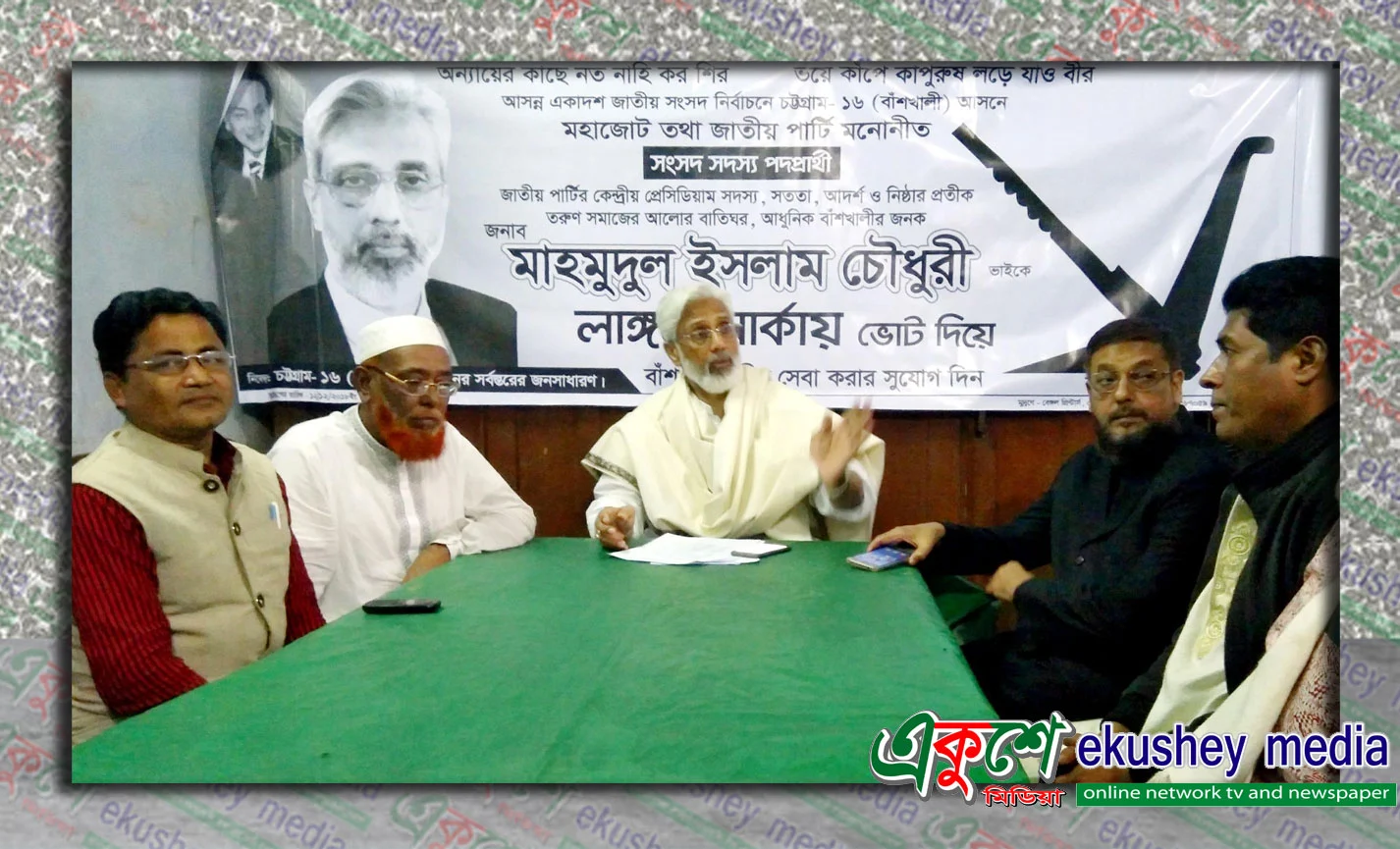 সাংবাদিক সম্মেলনে বক্তব্য রাখছেন জাতীয় পার্টির প্রার্থী সাবেক সিটি মেয়র মাহমুদুল ইসলাম চৌধুরী।